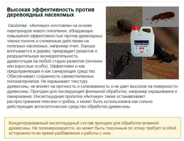 Однако для борьбы с древоядными насекомыми, личинками, жуками и другими членистоногими обычные антисептики, предотвращающие появление и развитие гнили и плесени – не эффективны, так как это абсолютно разные биологические организмы. Конечно же, по причинам более подробно описанным здесь некоторые виды ксилофагов (деревоядных насекомых), используют для пищеварения симбионтов, в качестве которых и выступают грибки и некоторые виды плесени, но это лишь малая группа «вредителей» которая не питается, например, сухой древесиной.