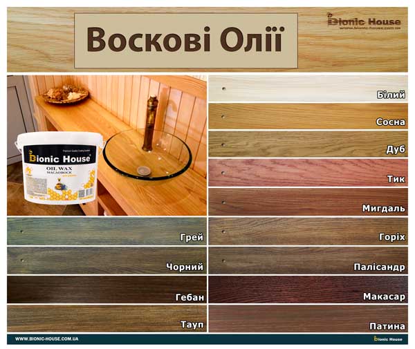 Властивості: Це на 100% природне покриття, що не утворює полімерної плівки. Віск на лляній олії не перешкоджає повітрообміну усередині волокон і прекрасно захищає деревину від змочування. Це відносно не дорогий і самий екологічний вигляд покриття в обробці деревом. Працювати з даним матеріалом легко і безпечно - він рівномірно розтікається і добре вбирається.